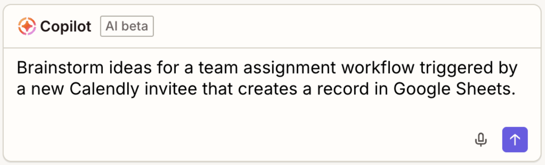 Need help coming up with a Calendly Zap? Zapier Copilot, our built-in AI assistant, can brainstorm automation ideas with you, suggesting steps, conditional logic, and apps to connect based on your needs. Just describe what you want to accomplish, and Copilot will map out potential approaches. Once you've landed on the right solution, it can build the Zap for you.