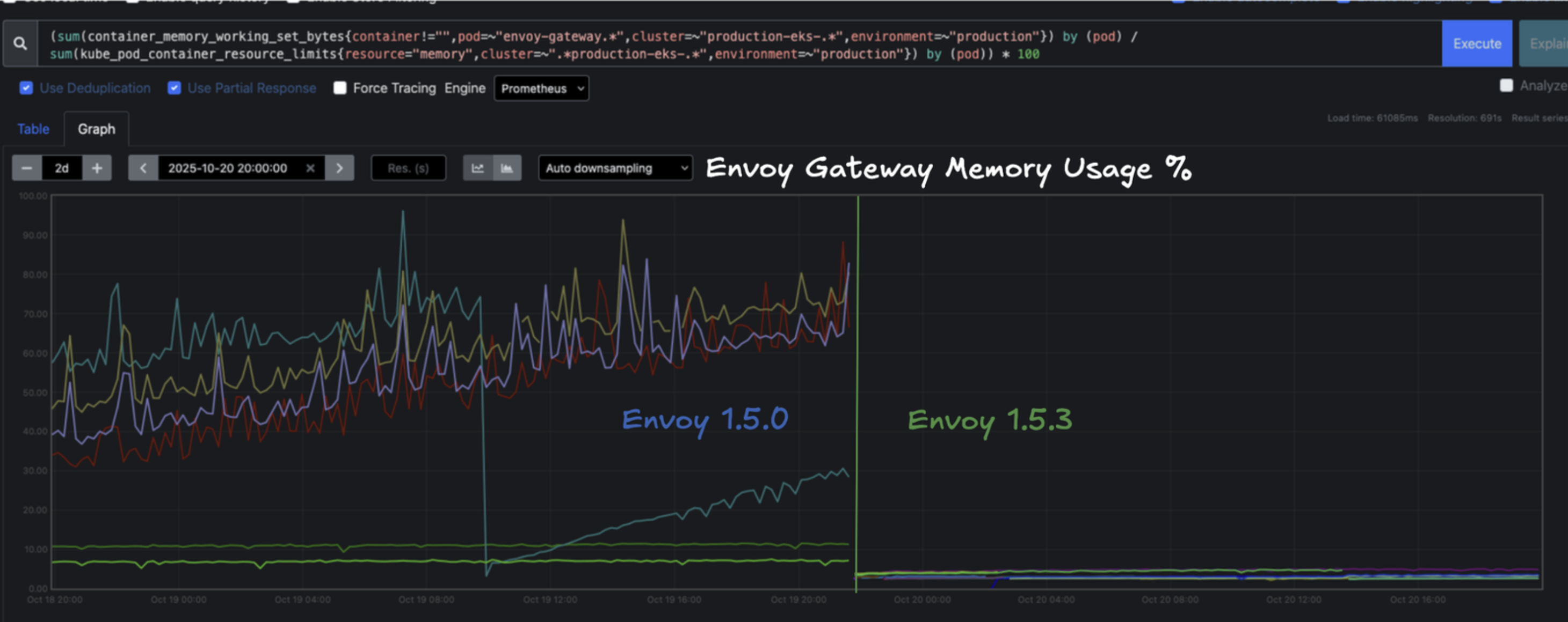 The upgrade from 1.5.0 to 1.5.6 changed that entirely. Remember our conundrum above around JSONMerge and high memory usage? Well that's now a thing of the past. Memory usage dropped from a consistent 80% average to below 20%, and we have not seen a related OOM event since on the control plane. These improvements make it easier to trust Envoy Gateway as the foundation for everything we run behind it. It's fast, stable, and improving with every release.