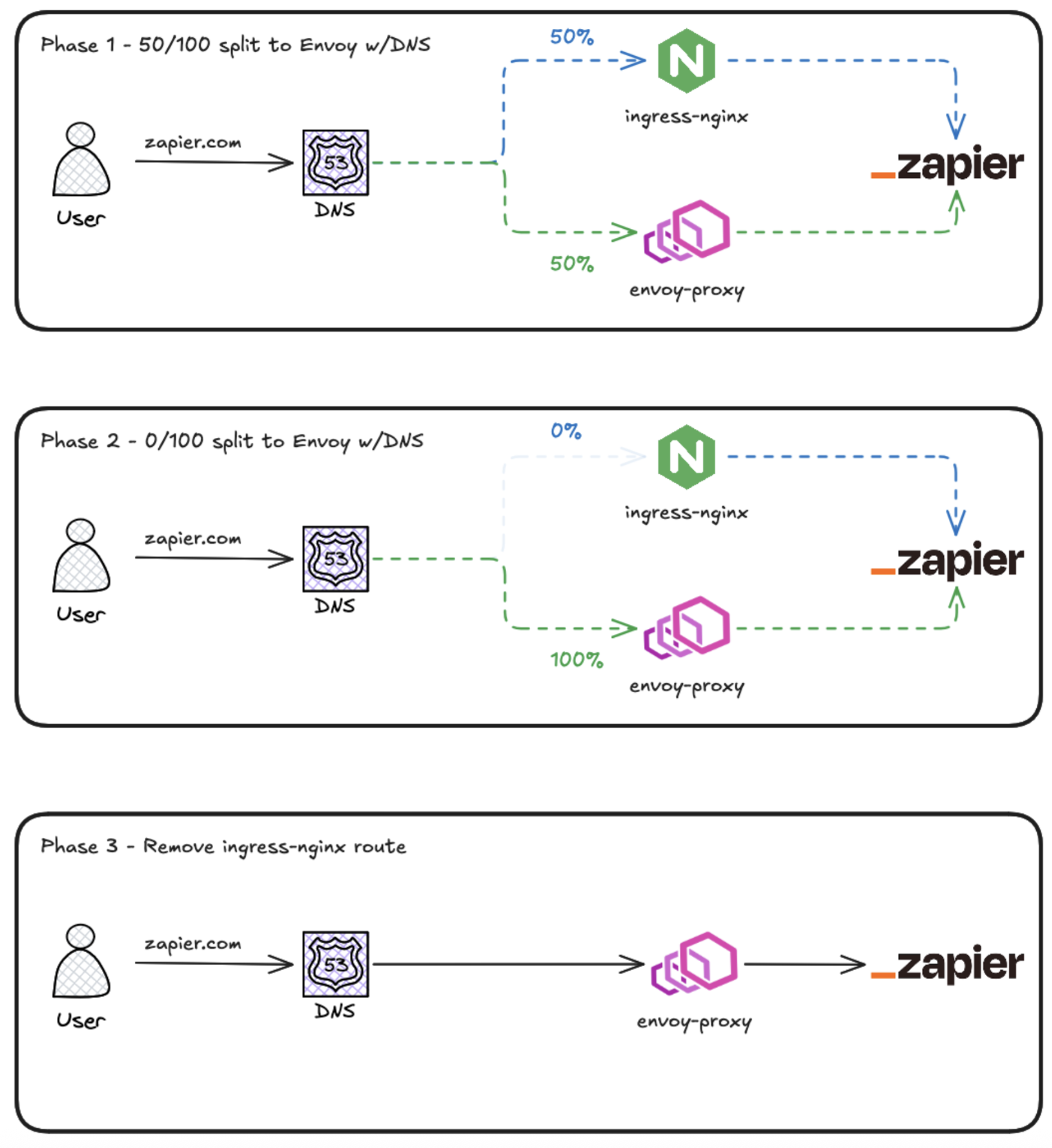 Weighted DNS was our friend. It allowed us to gradually shift traffic and observe metrics and traces to see if anything unexpected appeared.