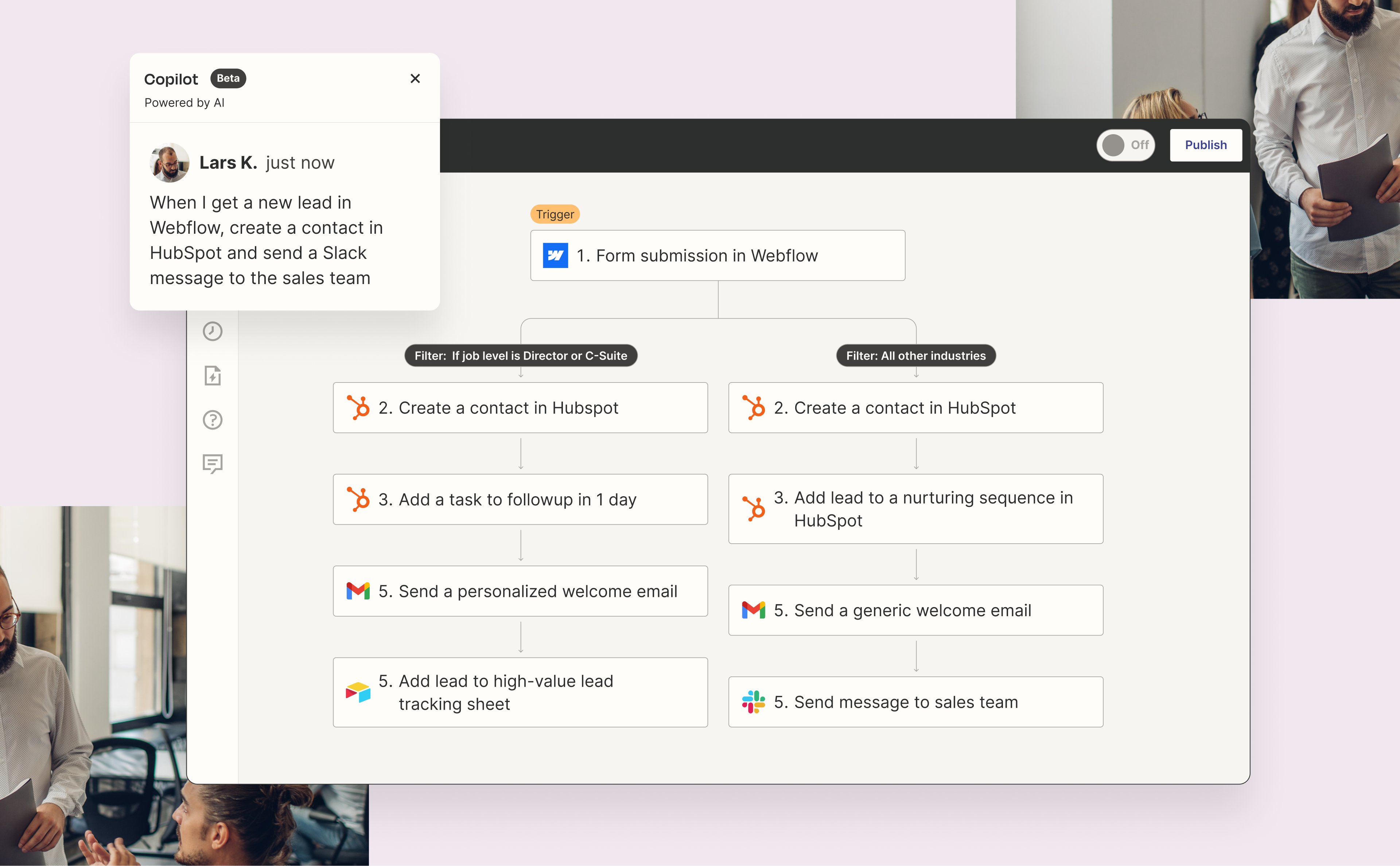 Simply describe the marketing automation you want—think lead capture or nurture—and Zapier's AI will help you quickly build your workflow.