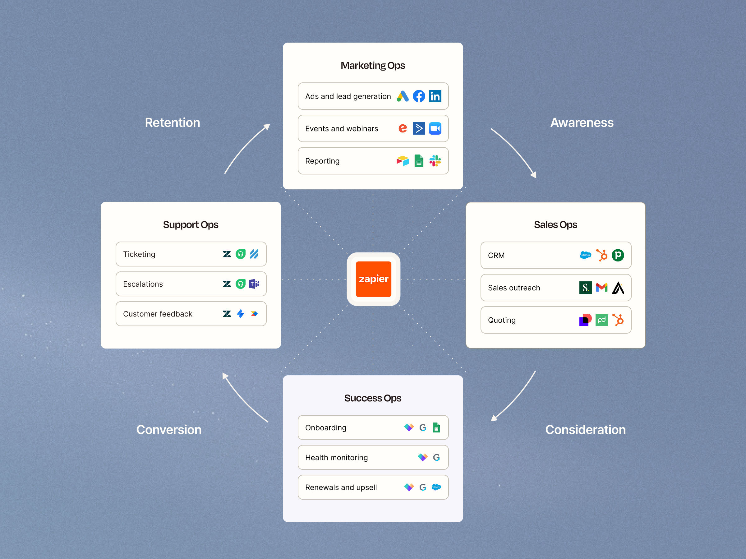 Elevate your RevOps game with Zapier's powerful automation. Manage leads, centralize data, and leverage product insights to drive sales—and that's just the start. Use Zapier to unlock endless automation possibilities and drive your organization forward