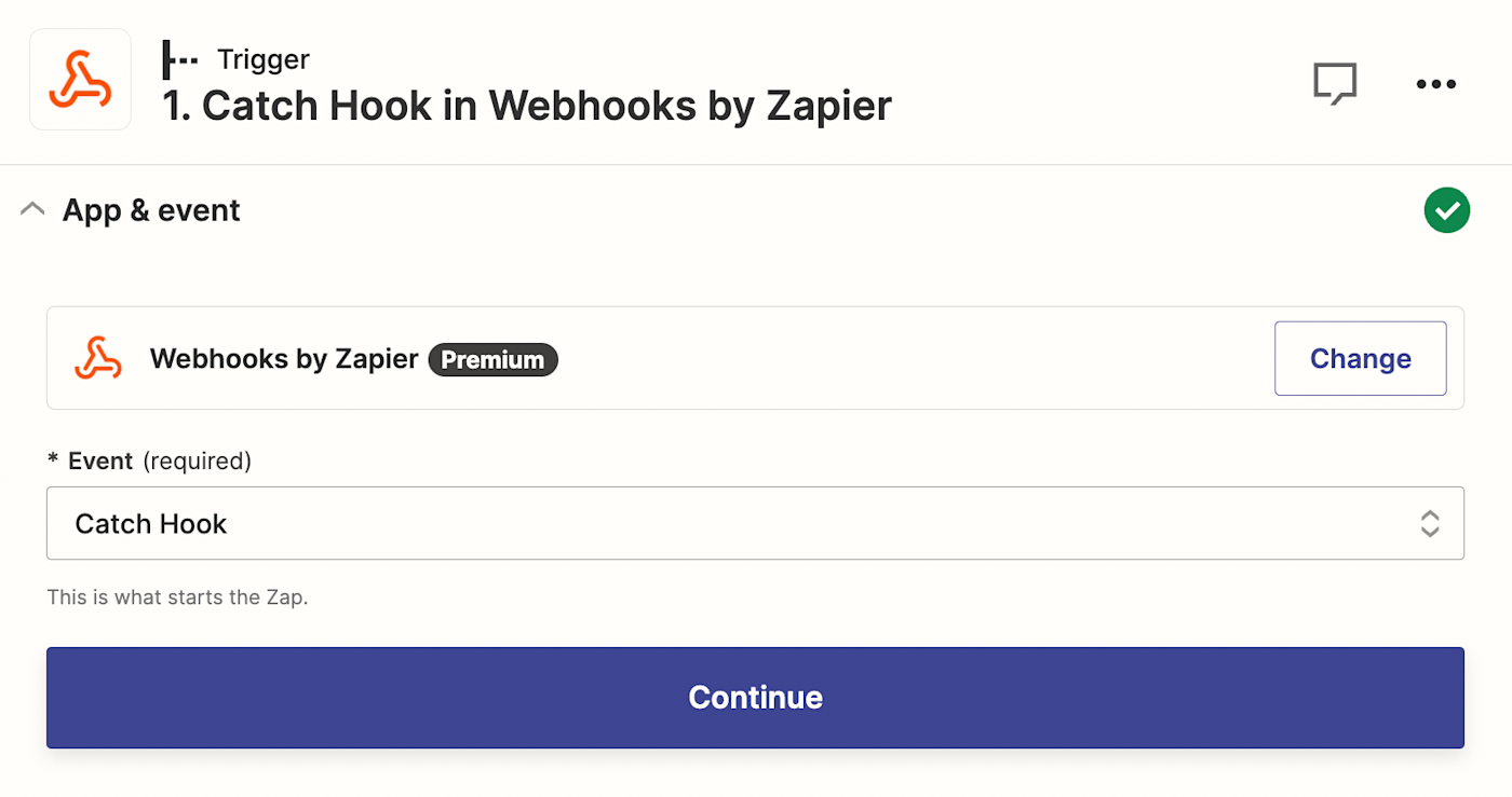 If you're creating from scratch, select Webhooks by Zapier as your trigger app and Catch Hook as your trigger event, then click Continue.