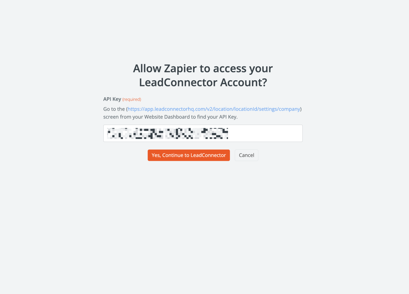 Paste your API Key into the field on the login screen, and click Yes, Continue to LeadConnector.