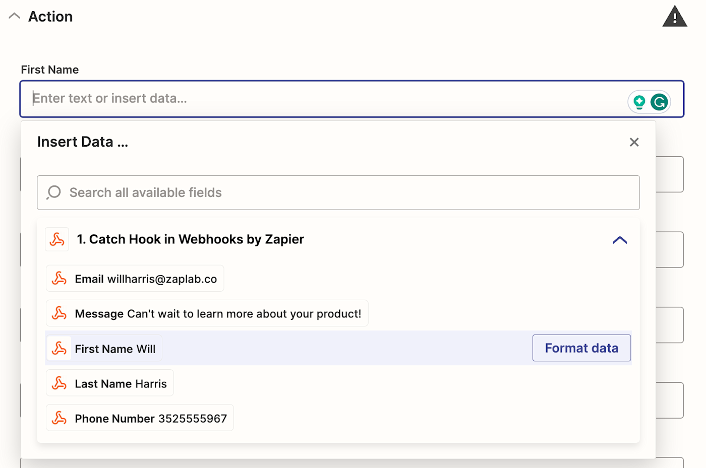 Now, it's time to customize your action step. When you click into a field, you can pull in info from your webhook and add it to specific fields in LeadConnector by selecting it from the Insert Data dropdown.