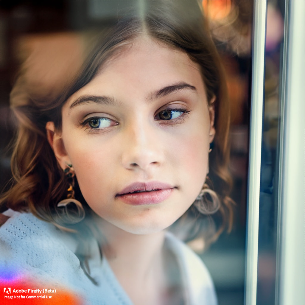 Here's an example of what Adobe Firefly can do with the prompt "a woman staring through a cafe window with her reflection in it, close-up, looking off into the distance."