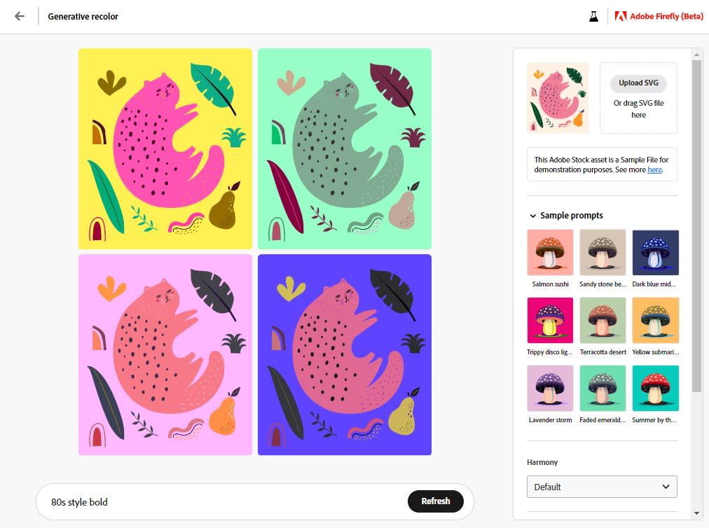 Now integrated into Adobe Illustrator, vector recoloring allows you to experiment with different color combinations quickly. Using one of Firefly's stock vector images, I used the recoloring prompt "80s style bold" and got a suitably Fresh Prince of Bel-Air-esque output.