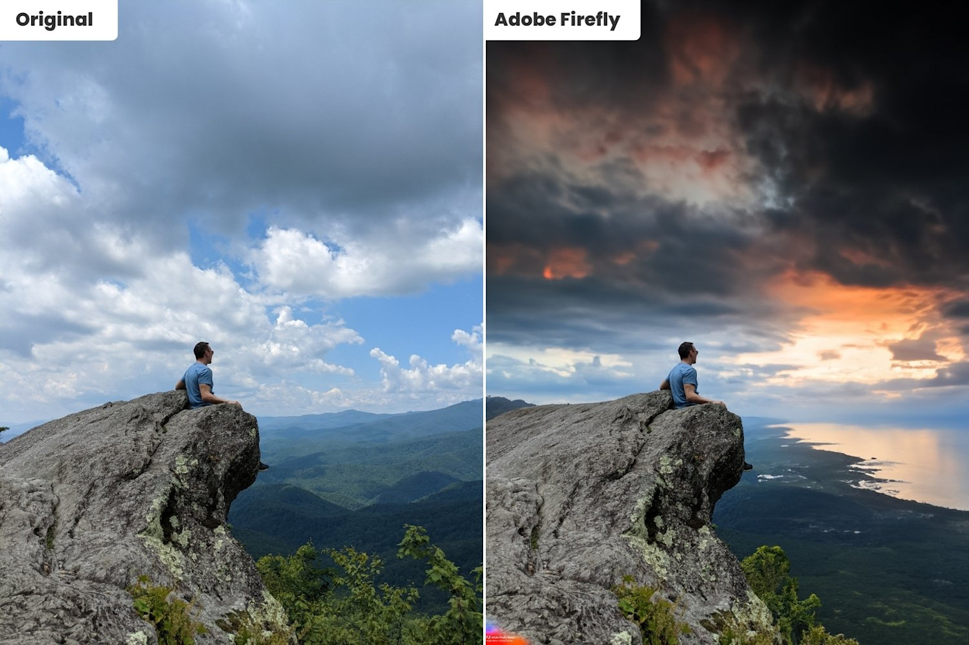 To test this feature, I uploaded a photo of myself looking out over the Blue Ridge Mountains in North Carolina. Then, I selected the entire background and instructed Adobe Firefly to change it to "watching the sunset over the ocean."
