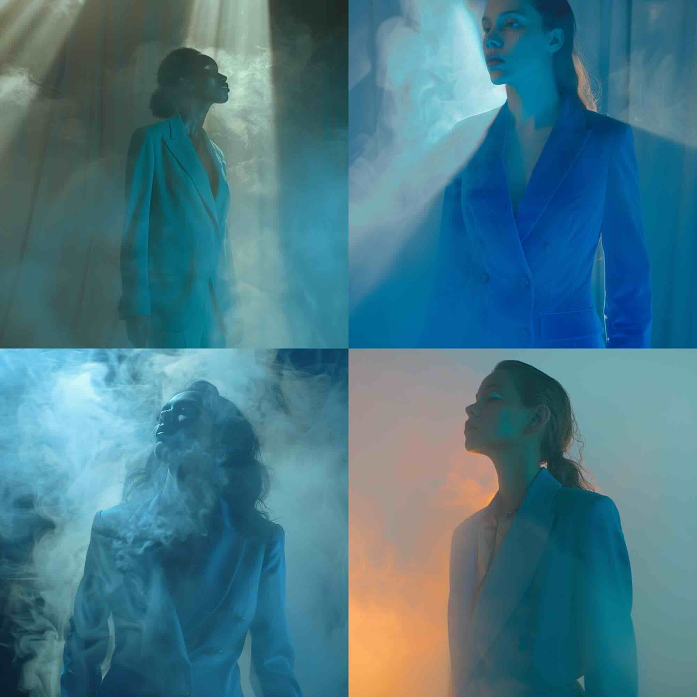 "A woman wearing a blue suit, light and shadow"