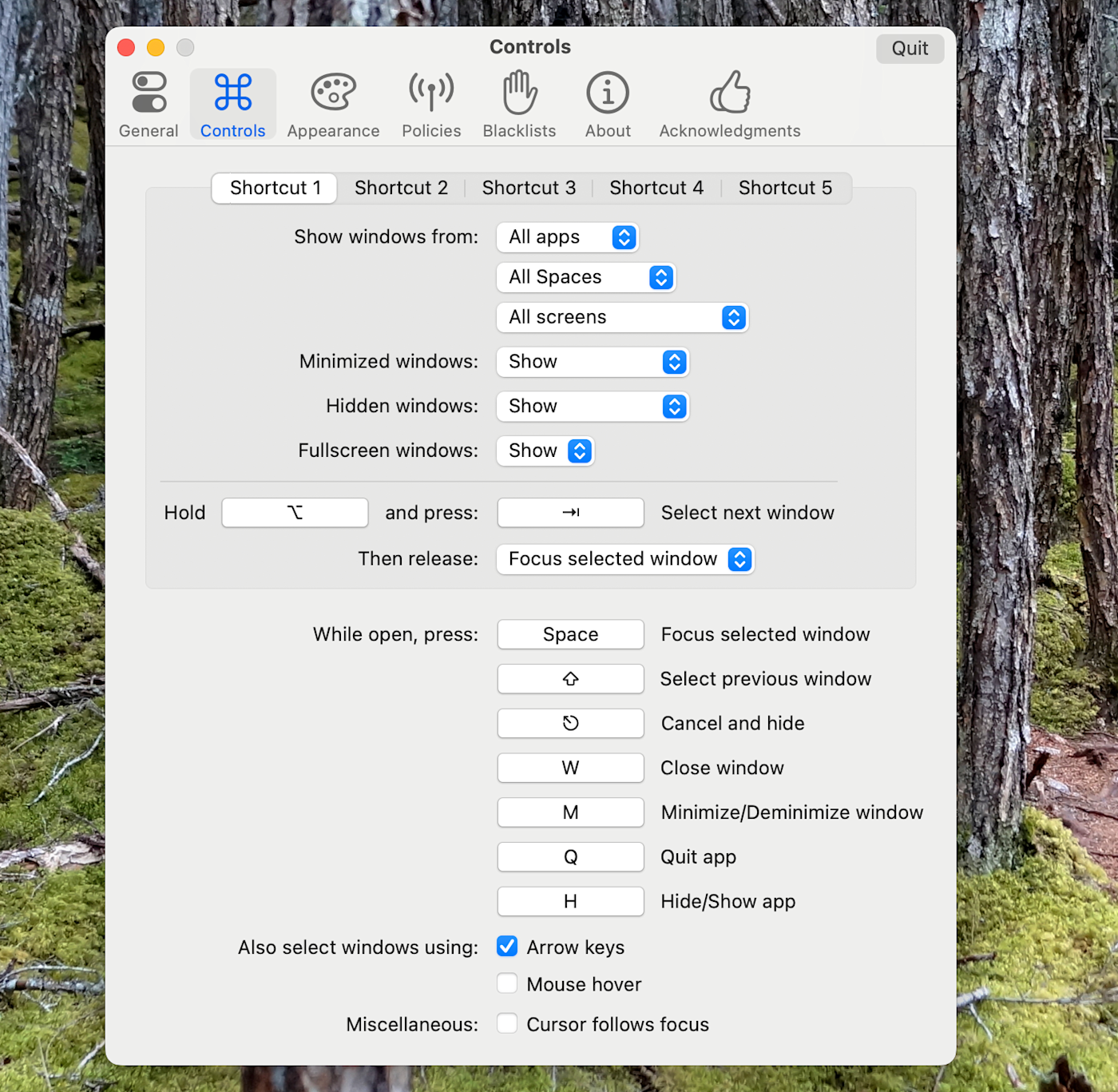 In the Controls tab, you'll find the ability to configure up to three different sets of keyboard shortcuts, plus a gesture shortcut. You could, for example, change the initial shortcut to control + tab. Or you could make a keyboard shortcut that only switches between windows that are open in the current space. Or you could decide not to include hidden windows.