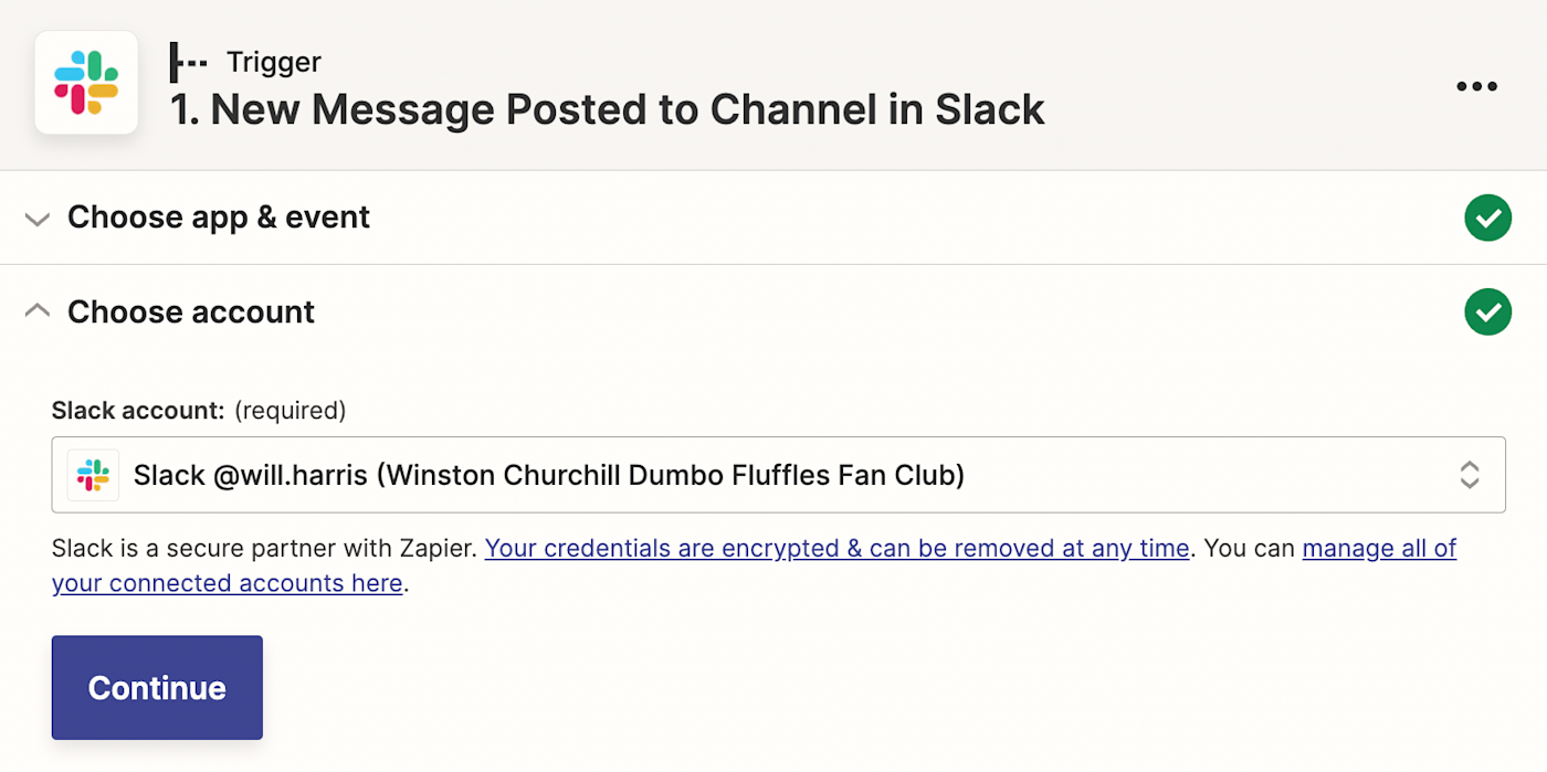 Then select your trigger event. With Slack, your Zap can trigger for a lot of reasons, like when a new message is posted to a channel, when a particular person is mentioned, or when a specific reaction is added to a message.