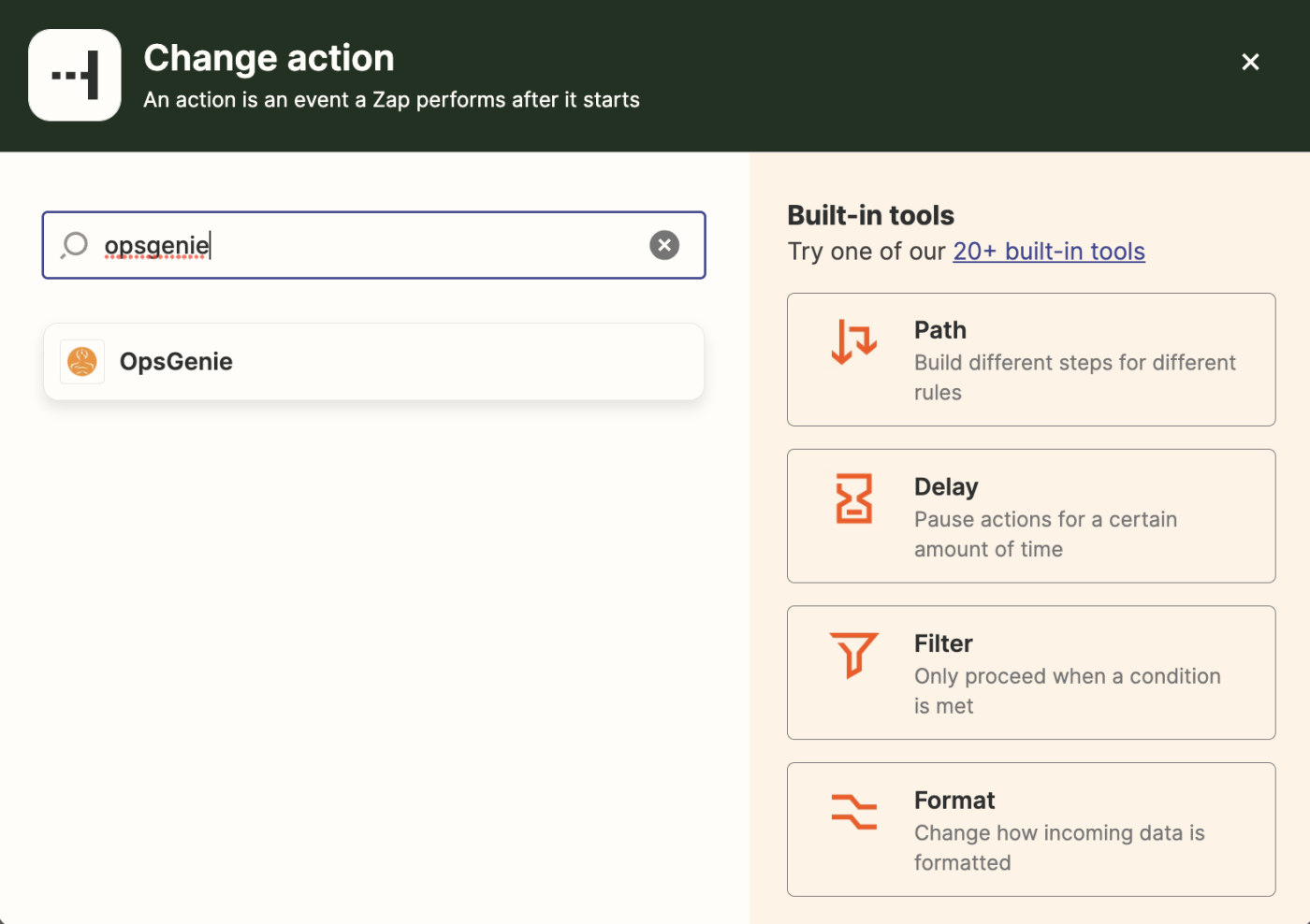 Now, it's time to set up your action—the event your Zap will perform once it's triggered. Start by searching for and selecting your action app, OpsGenie.