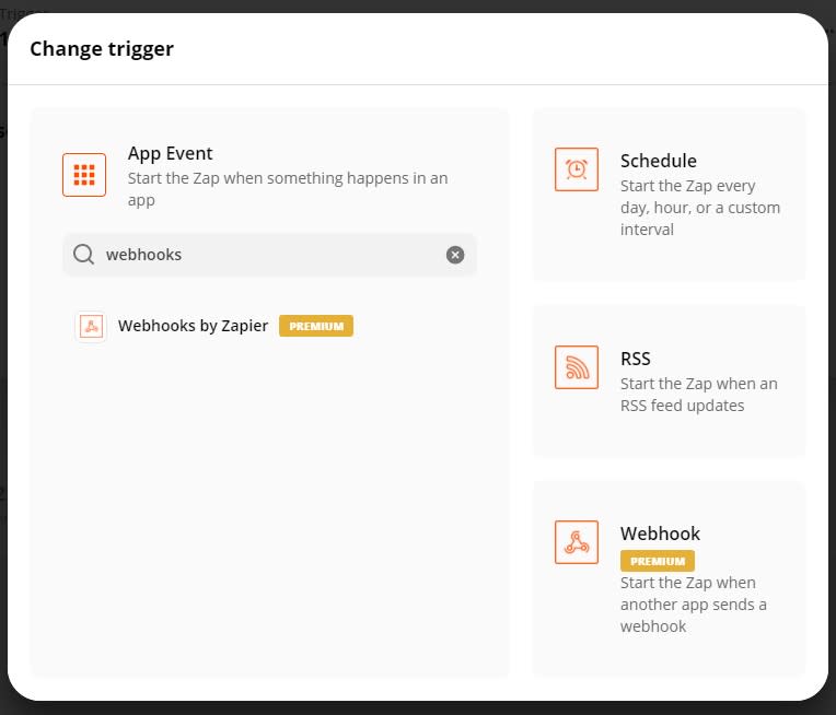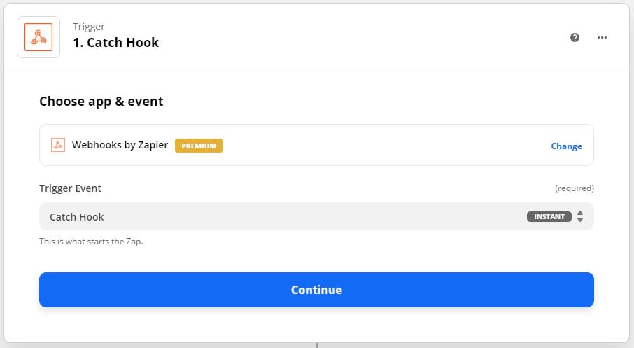 For your trigger, select Webhooks by Zapier in the App Event Section.