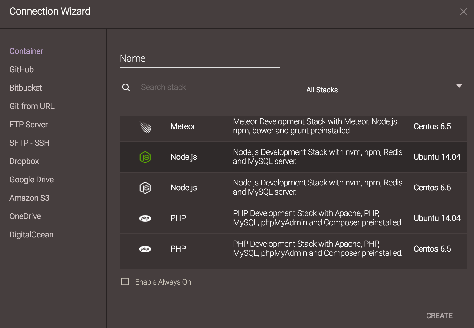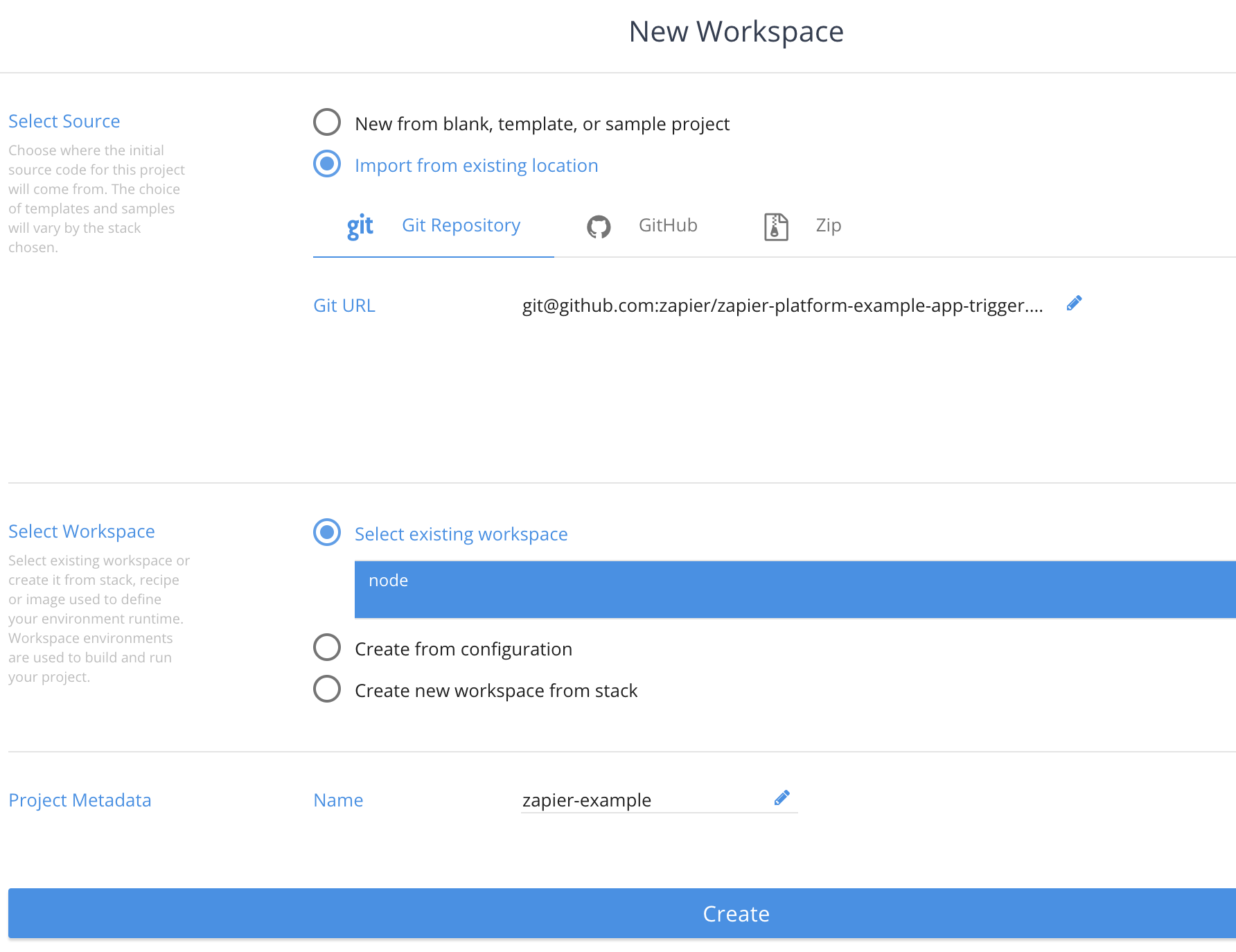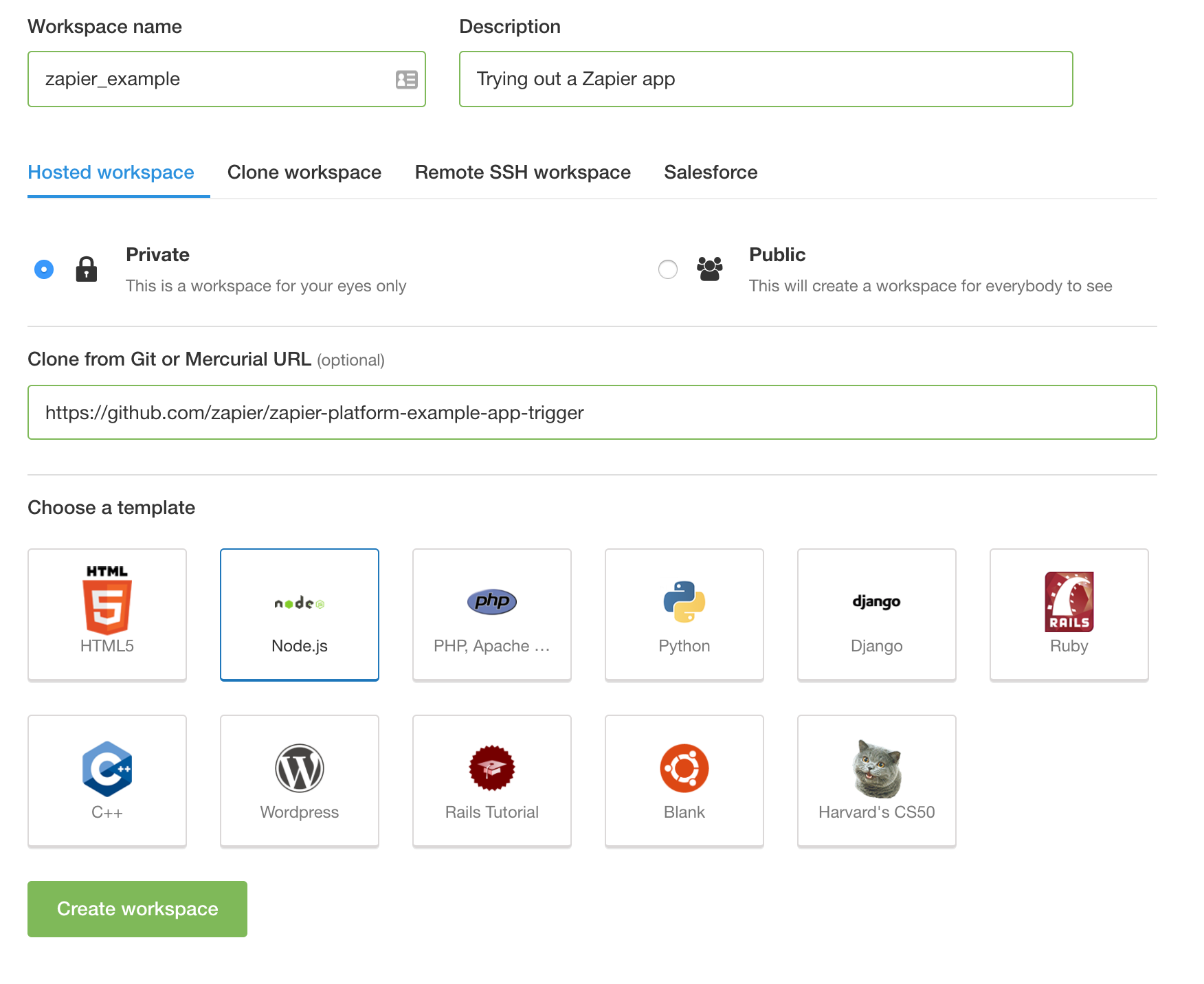 Once you’ve created your account, you’ll be walked through a series of steps to set up a workspace. While Cloud9 supports many languages and frameworks, I chose Node for this project. There was also the option to include a Git repository, so I included the Git URL for one of our example Zapier apps.