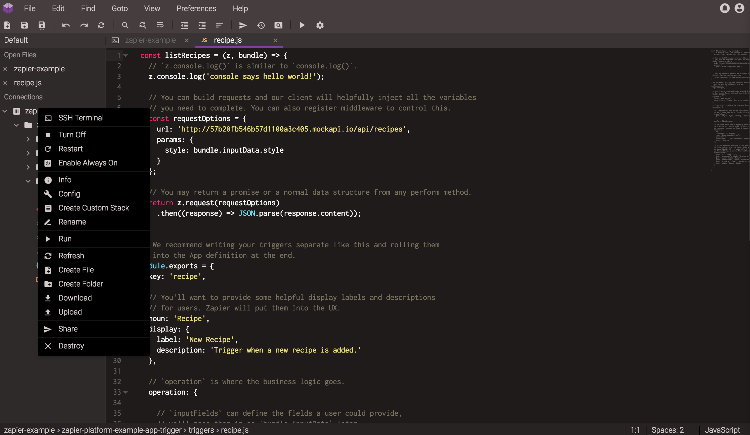 Since I wasn’t able to clone the Git repository at startup, I used the Zapier CLI to bring in the same sample app:
