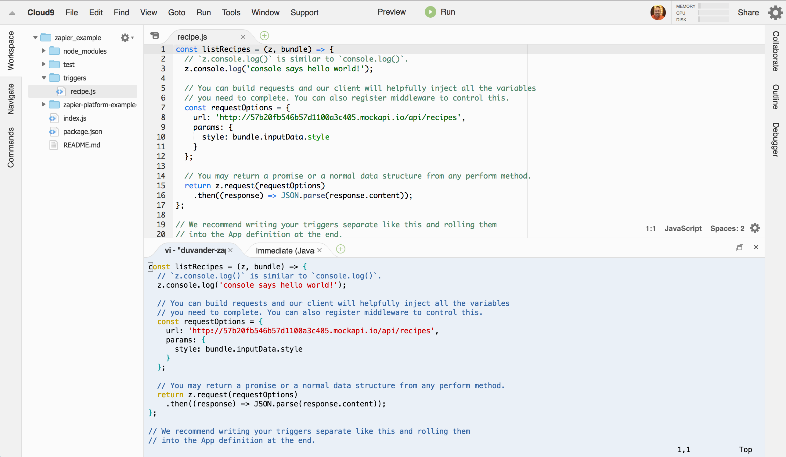 I've recently tried out several cloud IDEs as I work to make it easier for developers to try out the Zapier Platform CLI. My use case is one that is likely familiar to many developers: Running Node 6, installing modules, and pushing changes from the command line. And I’d like to do this from a browser, without needing to install or run anything else locally.