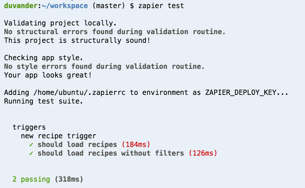 Now we can build our app, authenticating with zapier login (using your Zapier developer account credentials) and running zapier test as we make changes.