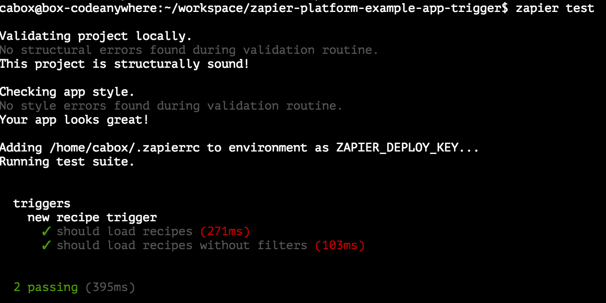 Finally, we can run zapier login and zapier test to see our app is ready for editing: