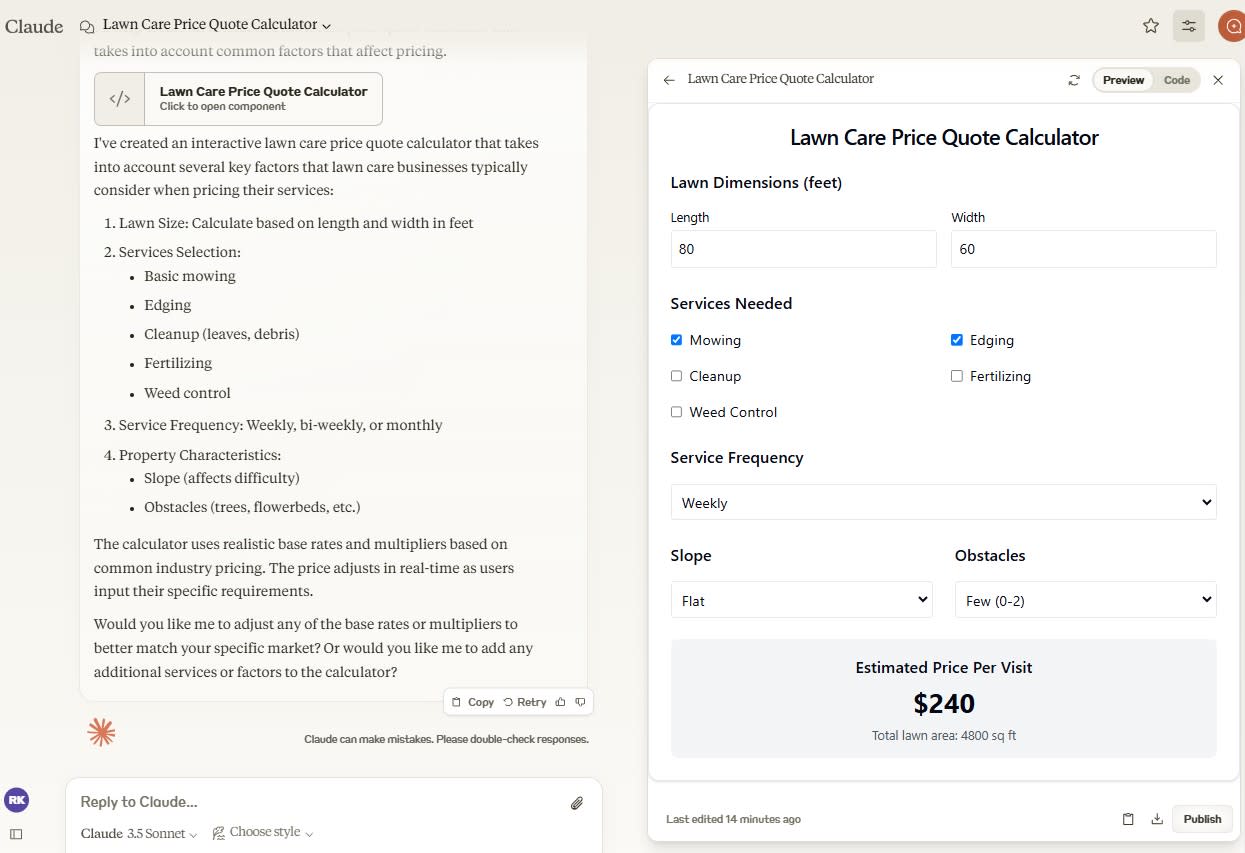 If you're non-technical, a simple way to test this is to start talking to Claude normally, via text prompting, and ask it to turn the data it shares with you into an interactive React component. For example, here's a Lawn Care Price Quote Calculator I spun up in a few seconds.