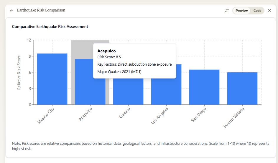 Here's an example of how user-friendly this can be. After asking Claude about the risk of earthquakes on the west coast of the US and Mexico, it created its own "risk score" for a handful of cities based on historical data, geological factors, and infrastructure. Then I asked for it to visualize this data in a chart, which Claude promptly did using interactive React components.