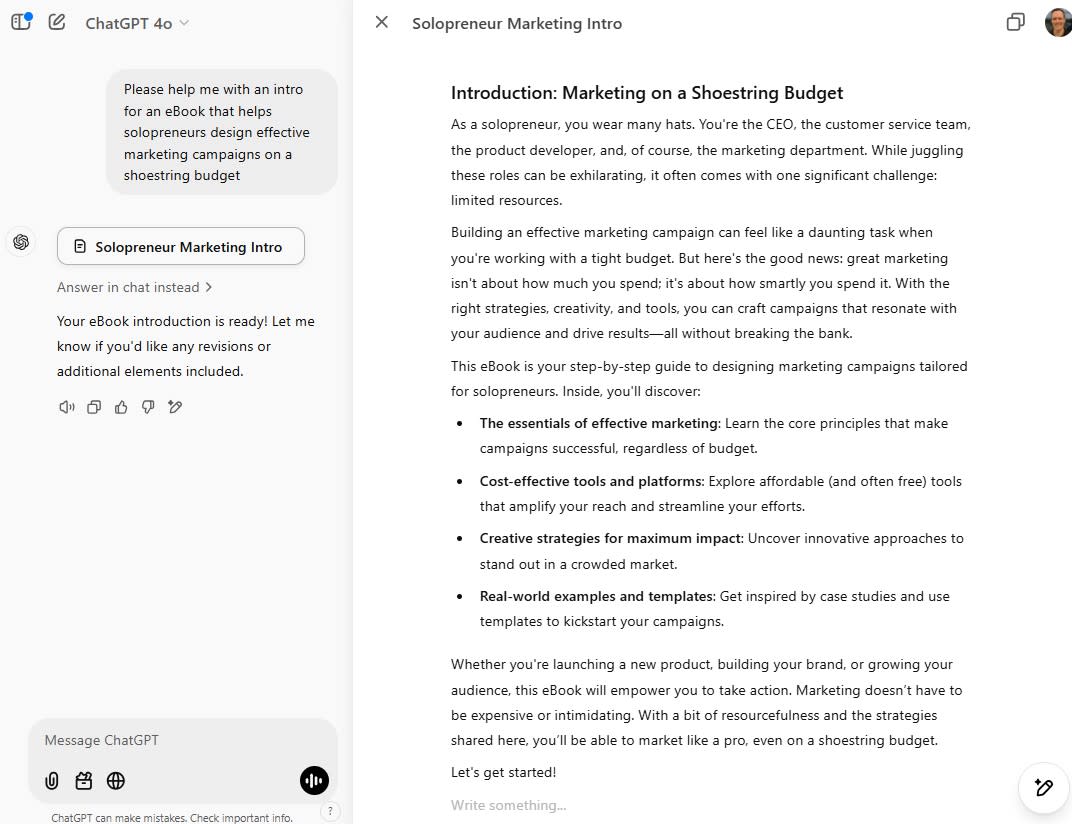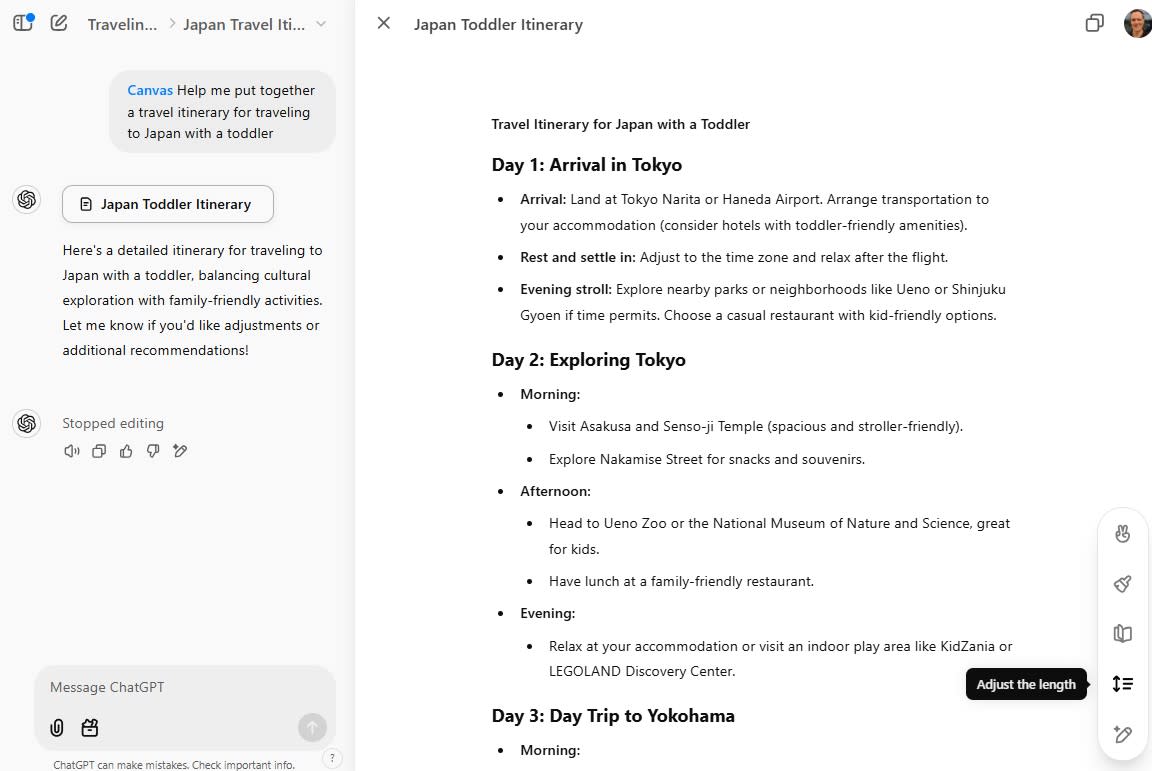 ChatGPT's edge when it comes to creative projects—besides its ability to generate images and video, which I'll cover next—is its Canvas feature, which lets you edit documents right inside of ChatGPT. Canvas makes it easy to adjust your document's length, add emojis, rewrite the text at a different reading level, or provide custom instructions.