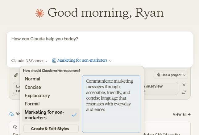 Claude's Styles feature also makes it easier to jump between different custom writing styles. For example, you could set up an informal writing style for internal memos, a peppier one for social media posts, and a thoughtful one for long-form content.