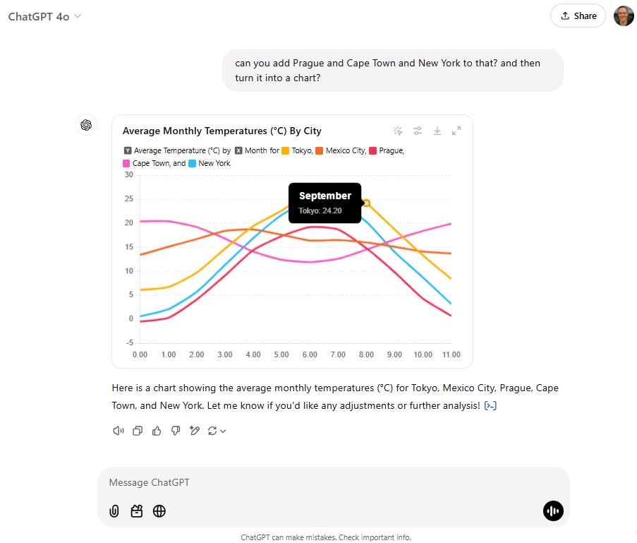 Similarly, ChatGPT helped me quickly round up the average monthly temperature for a handful of big cities around the globe and put them into an easy-to-read chart, complete with interactivity and editable color coding.