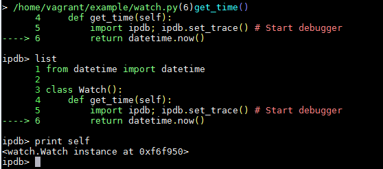 Last up is iPython's ipdb. Like its *pdb brothers, the interface is a simple command-line and the help system is a great place to start digging in. What makes this one different from the rest is that it uses an iPython shell, so all the tab-completion and object introspection goodness of iPython is available to help you see exactly what is going on. Combine that with great syntax highlighting and a where command with the best formatting, and you have the perfect weapon to slice through your bug.