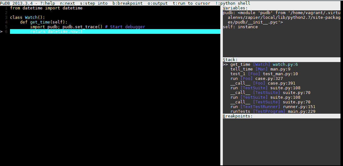 The left-panel shows the code for the current file (or other files as you move up and down the stack). Navigation is superb, with arrow keys (and “hjkl” for Vim folk), search, and the ability to open other modules with a fuzzy-match search. Combine this easy movement with a shortcut key to execute code to the current cursor position and you have a very intuitive and friendly way step through programs. Of course, pudb still provides the regular slew of breakpoint and stepping commands to control execution as you see fit.