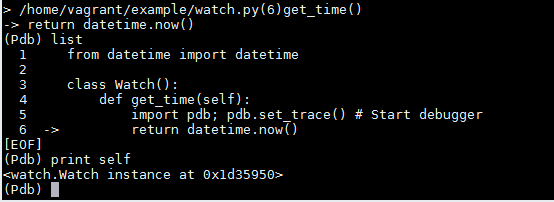 Next up is pydbgr (trepan for Python 3.2+). This project is a rewrite of the pydb debugger. It offers a very similar set of commands to pdb, although some of the helpful aliases like “u” for “up” are missing.