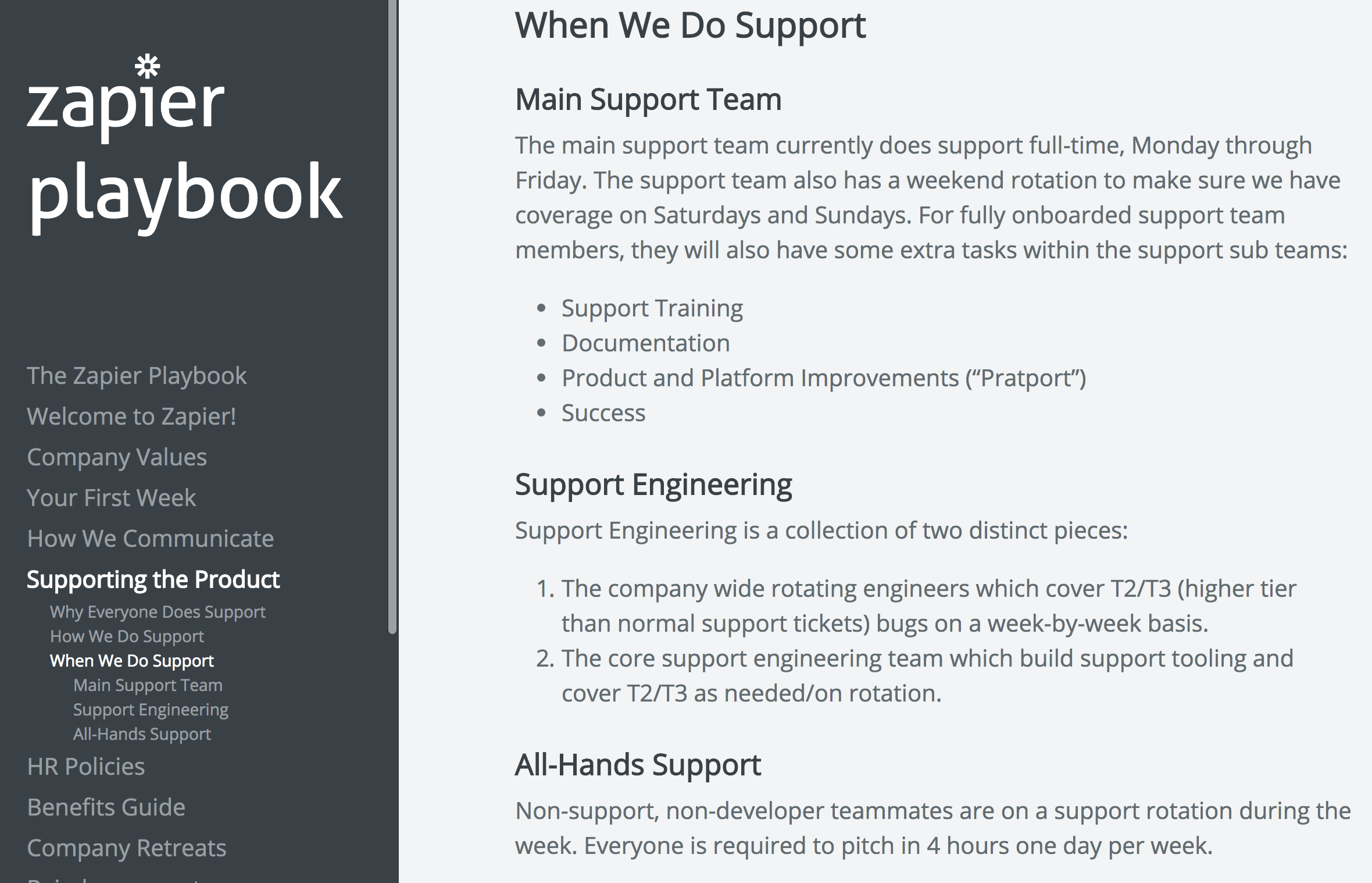 At Zapier, we do a lot of the typical HR things upfront, like provision accounts to our tools, order gear so it arrives by the start date, and ask the new person to read our company playbook. A quick note on the playbook: your employee handbook doesn’t have to be a horrid looking PDF or printed binder that nobody wants to read. Make it useful and approachable.