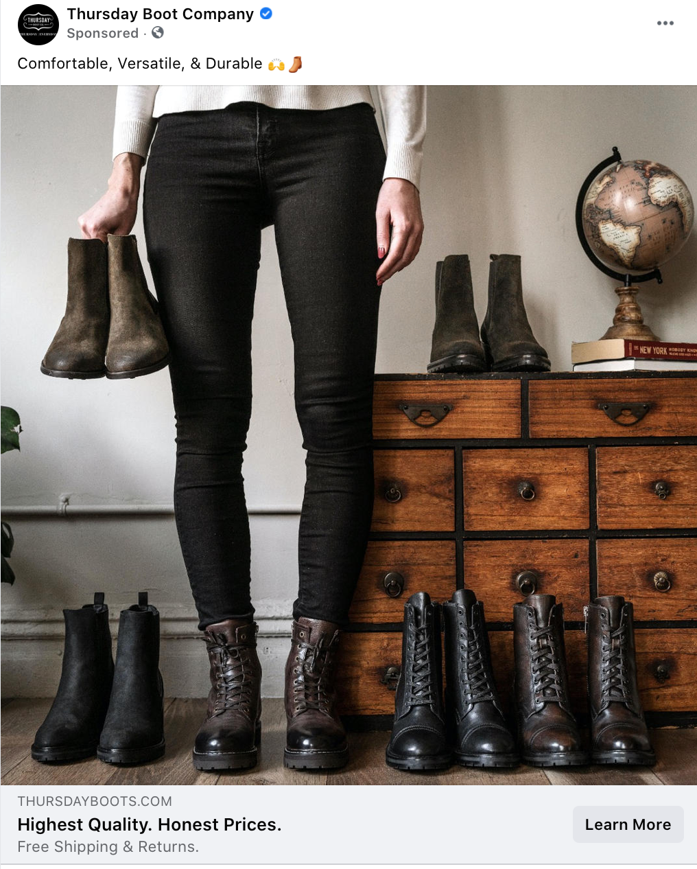 In the example below, Thursday Boot Company has an image-heavy ad showing multiple products. They use the text "Comfortable, Versatile, & Durable" with two emoji at the end. With just three words, they address some of the biggest concerns people have when purchasing, aside from the look of boots (which the image takes care of).