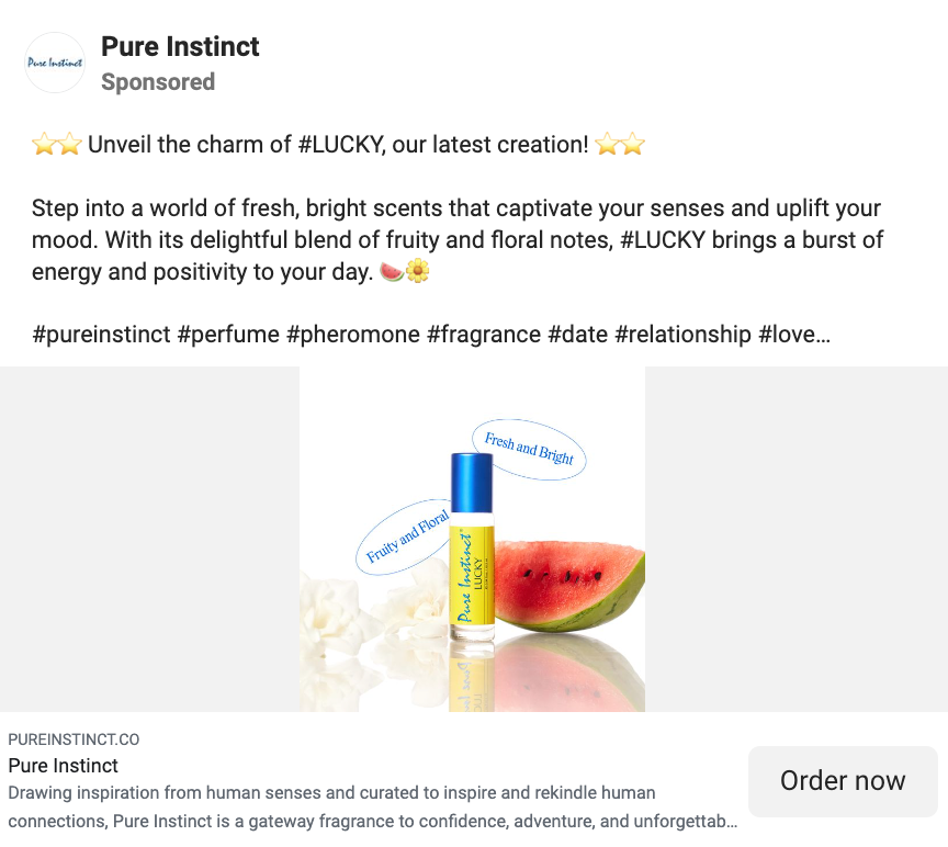 Scents are difficult to describe and a little subjective, so a perfume company like Pure Instinct has to be on its writing game. This ad for its LUCKY scent uses adjectives like "fresh," "bright," "fruity," and "floral" to evoke the same sensation as the scent. Every word in the ad paints a picture of how the perfume will make you smell and feel.