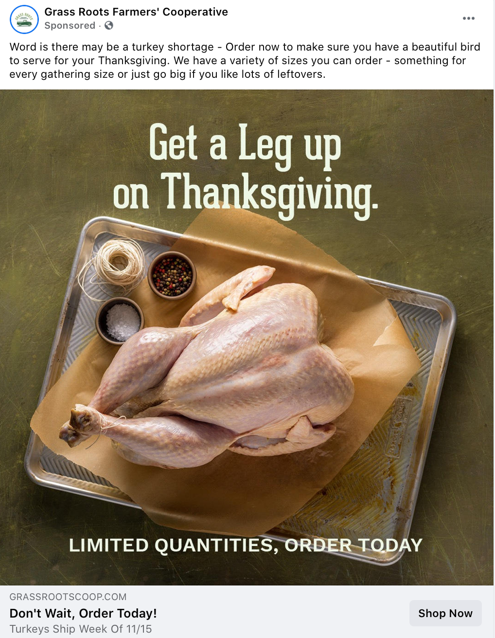 In this ad, Grass Roots Farmers' Cooperative talked about how there might be a turkey shortage (topical) and how you should order now (urgency) to make sure that you have a turkey for your family's Thanksgiving (seasonal). It hits all the right notes—at the right time.