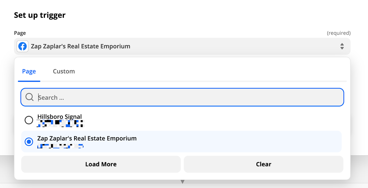Connect your Facebook account, then select which of your Pages you want to use with Zapier. You'll then need to give Zapier permission to manage your Page to finish linking your account.