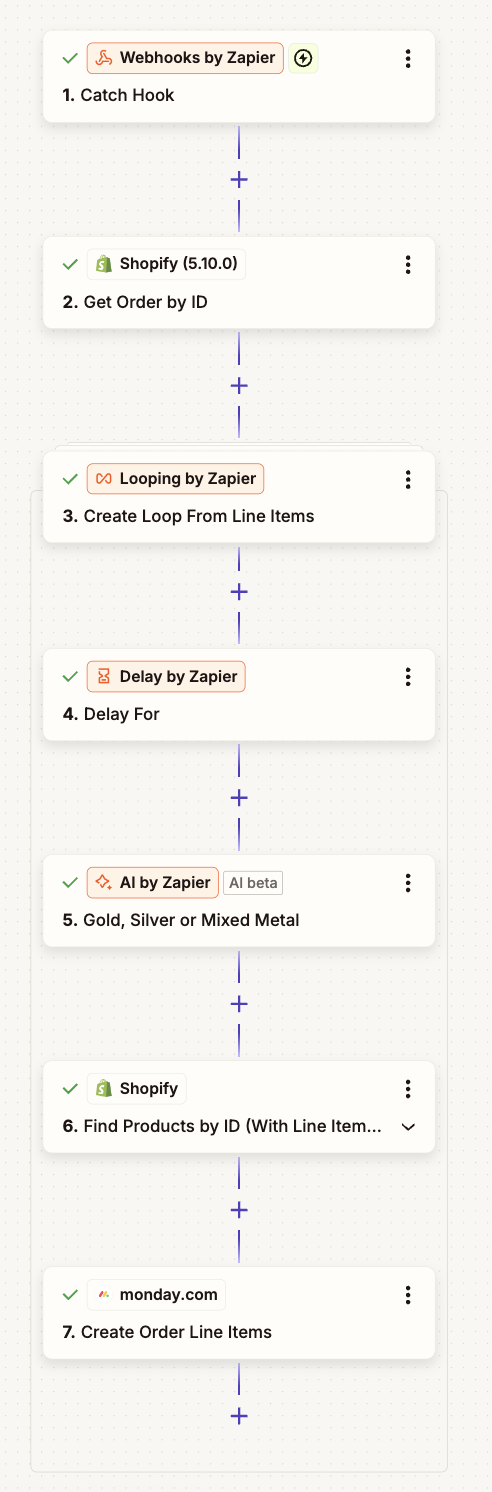 The team uses Shopify to manage sales and Monday.com to coordinate production, but there was no structured connection between the two. Important order details, like metal type or product size, were hidden in long-form product descriptions. Since the production team worked in Monday.com, someone had to manually extract and reformat the data before fulfillment could begin.