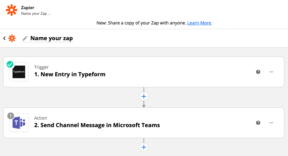 If you've created Zaps before, making them within Microsoft Teams will look just like the Zap Editor on our site. You just don't have to exit the Teams app to do so.
