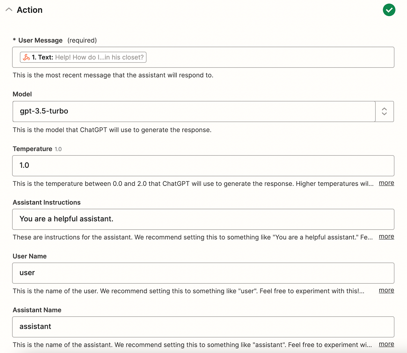 Pick the ChatGPT model you'd like to use. Then, in the User Message field, map  data from your Slack step, pulling in a sample question posted in your Slack channel of choice. To map data from a previous step, click the + sign in the field or type a forward slash (/).