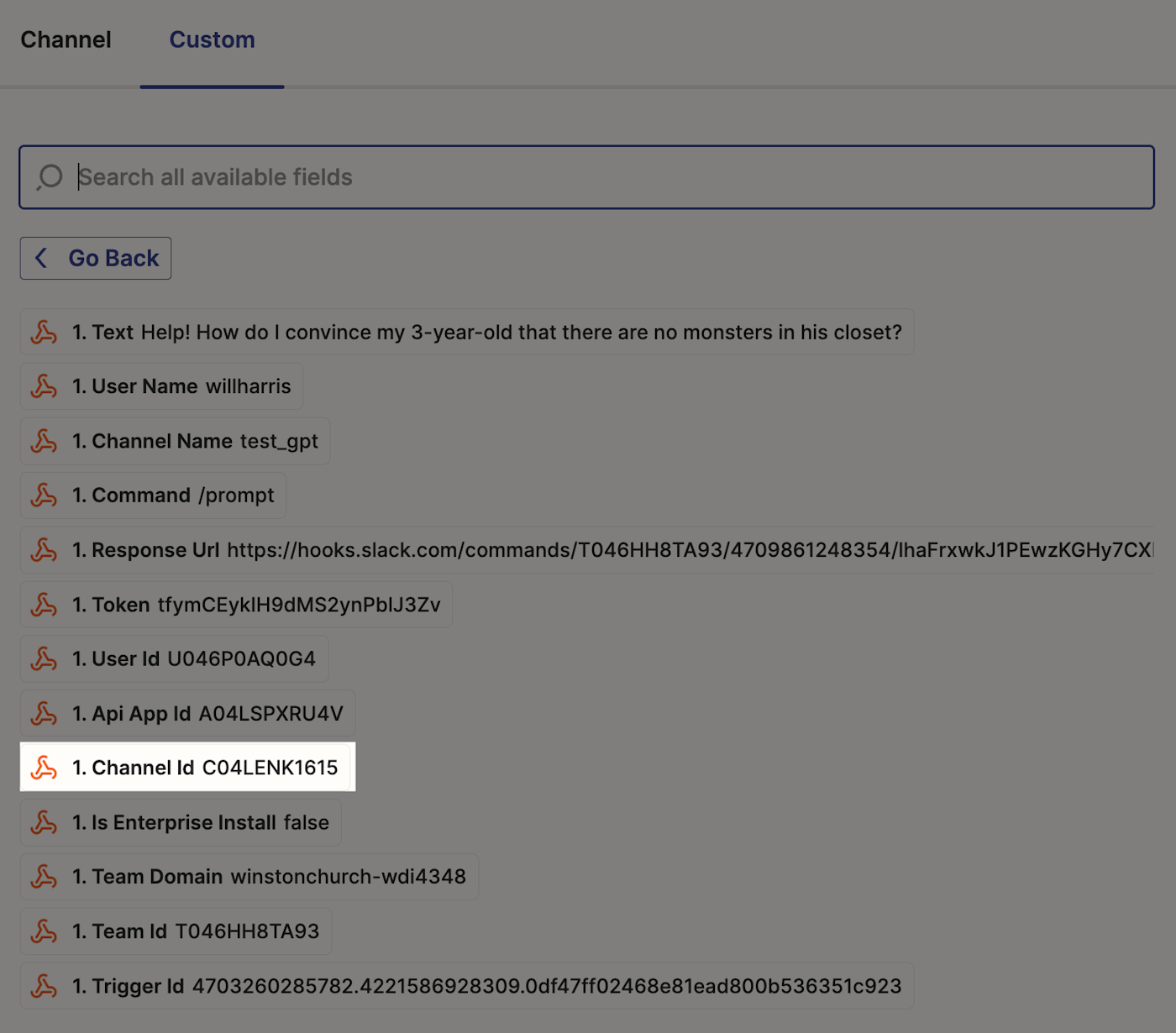 After that, go back to the Zap editor and click Test Trigger. Zapier will pull in your test prompt from Slack, as well as other information, like the channel and username.