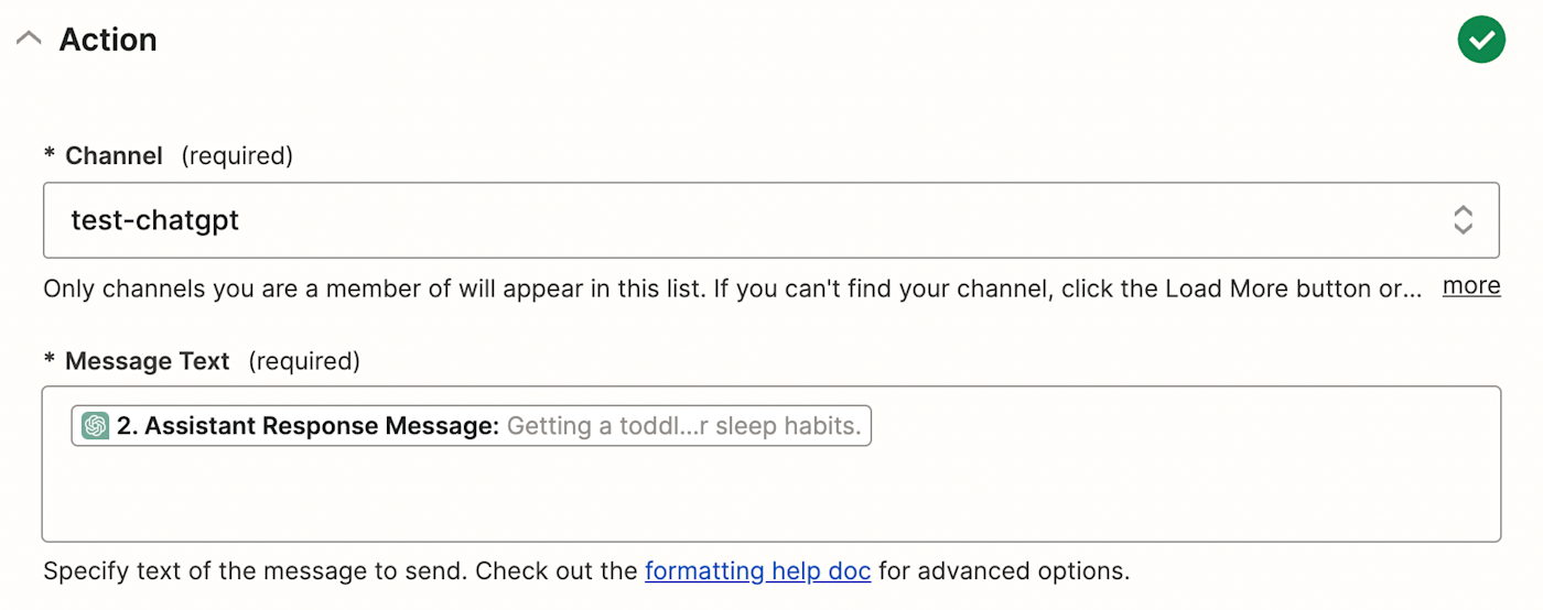 This will let your Zap know to post your ChatGPT result where your slash command was entered rather than in one specific channel.