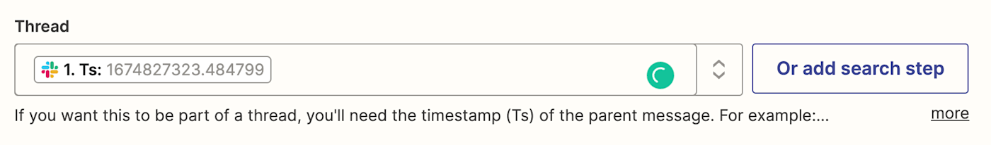 If you'd like your bot to reply in a thread rather than in your Slack channel (and I recommend this), navigate down to the Thread field. Click in the field and select the timestamp (shown in Zapier as Ts) of the parent message in the dropdown to let Zapier know which message to create a thread for.