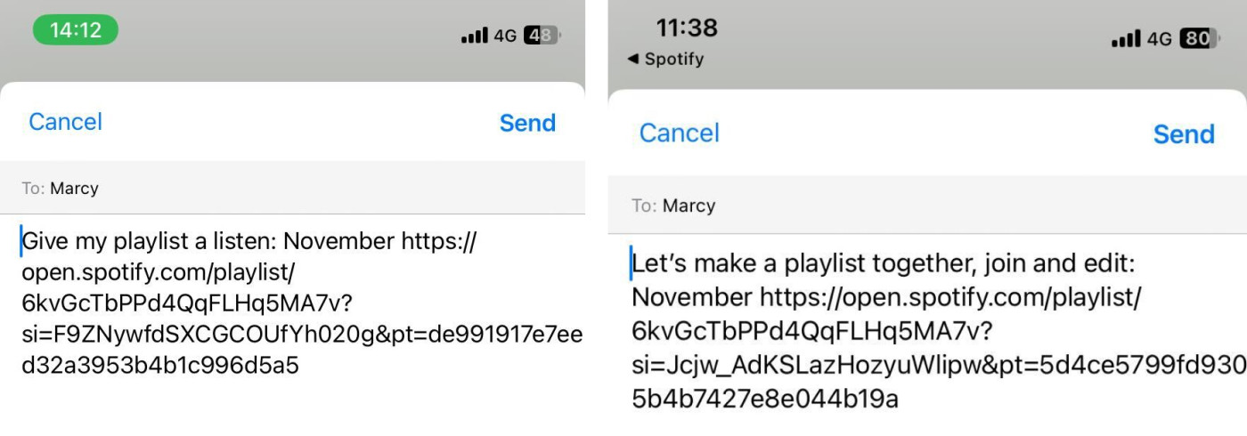 If you share the playlist via WhatsApp or Instagram messages, for example, Spotify will automatically populate a brief message ("Give this playlist a listen") along with a link to the playlist. Click Send.
