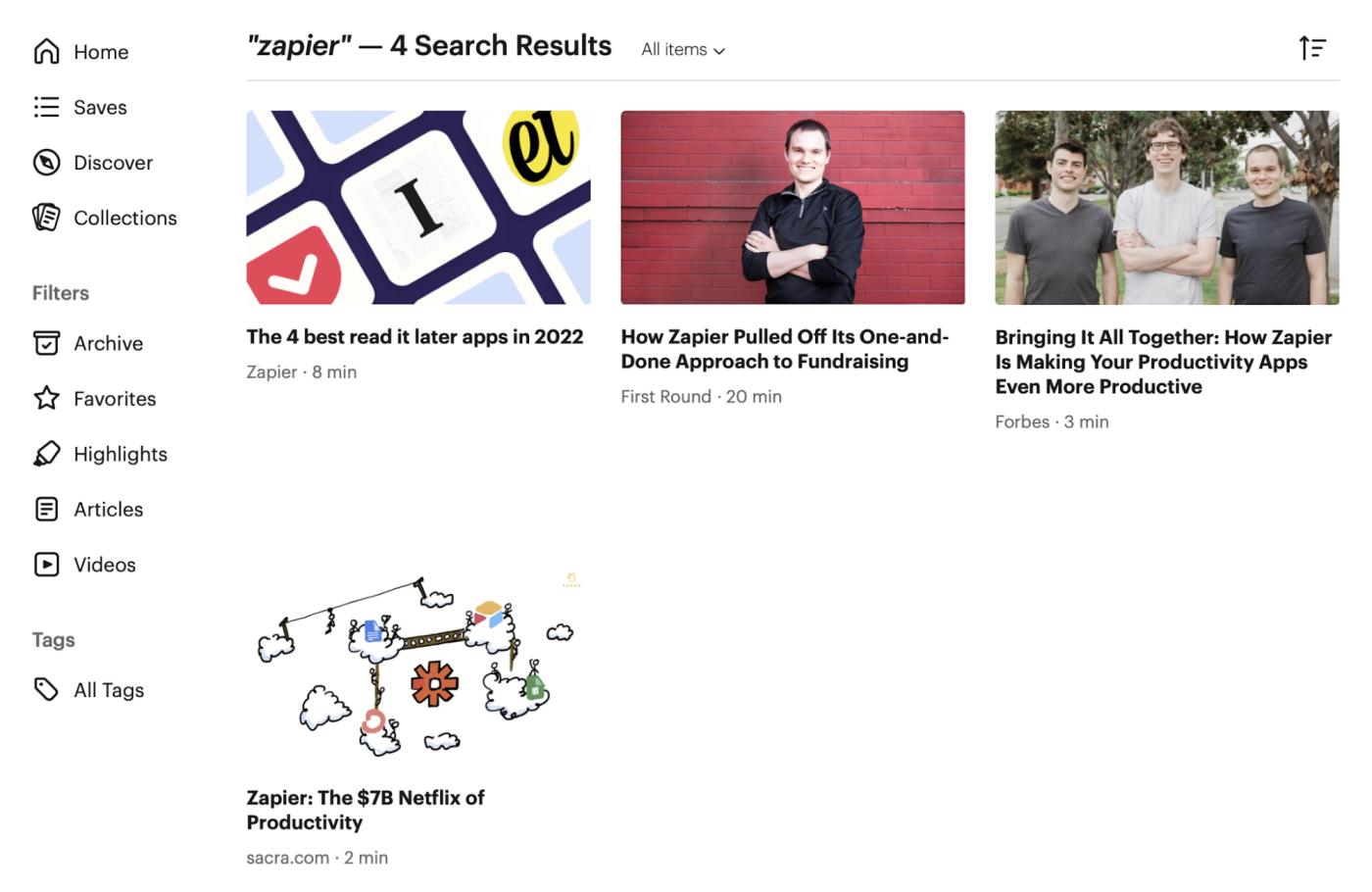 If you pay for Premium, you can search the full text of your articles for keywords, or even limit your searches to specific tags. Include a tag like #productivity in your search terms, and only articles with that tag will be included. This is especially helpful if you use the service as a research tool, saving many articles on a certain topic at once.