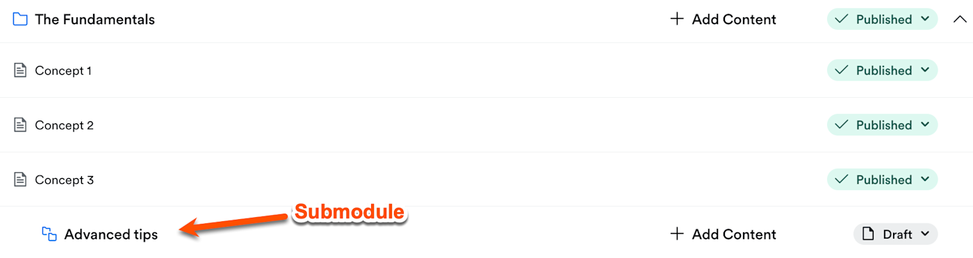 The Kajabi course structure consists of modules and lessons. Plus, you can go one level deeper by creating a nested submodule.
