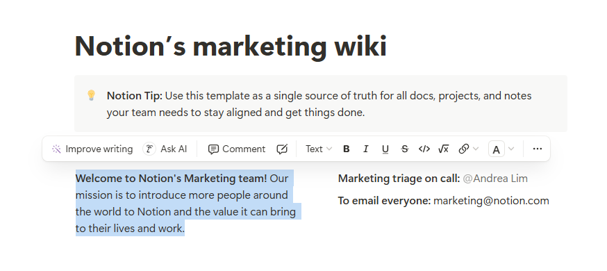 Notion makes accessing its available tools and options easy with thoughtful prompts. For example, when you select text on Obsidian, it won't bring up any menus to customize it. On Notion, doing so brings up an exhaustive pop-up, where you can find several handy shortcuts to format the text, add a comment to it, ask the built-in AI about it, and more.