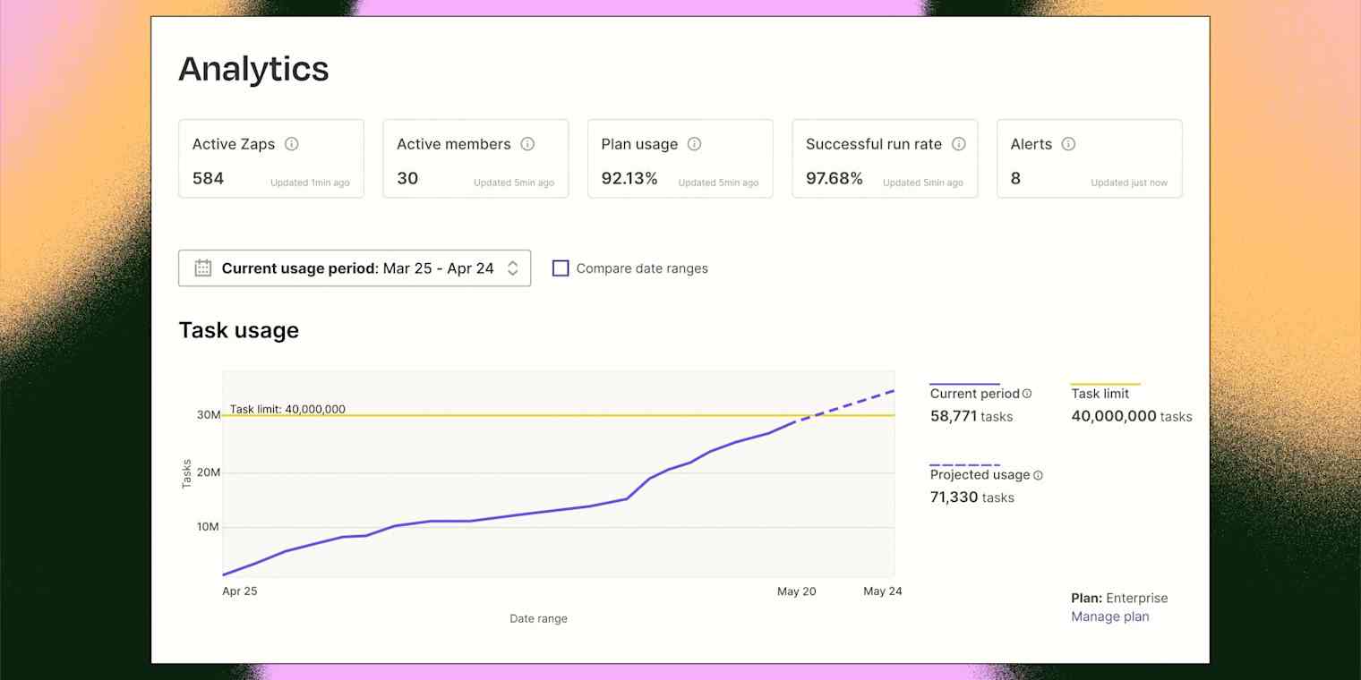 We're excited to share some powerful updates to our Analytics dashboard that will transform the way you visualize and utilize your team's data. Our redesigned interface makes analytics less overwhelming and more actionable. With a cleaner interface and included definitions, you can easily understand your metrics at a glance. Discover how much time Zapier has saved your team, measure your plan usage, and troubleshoot alerts—all from a single, seamless dashboard.