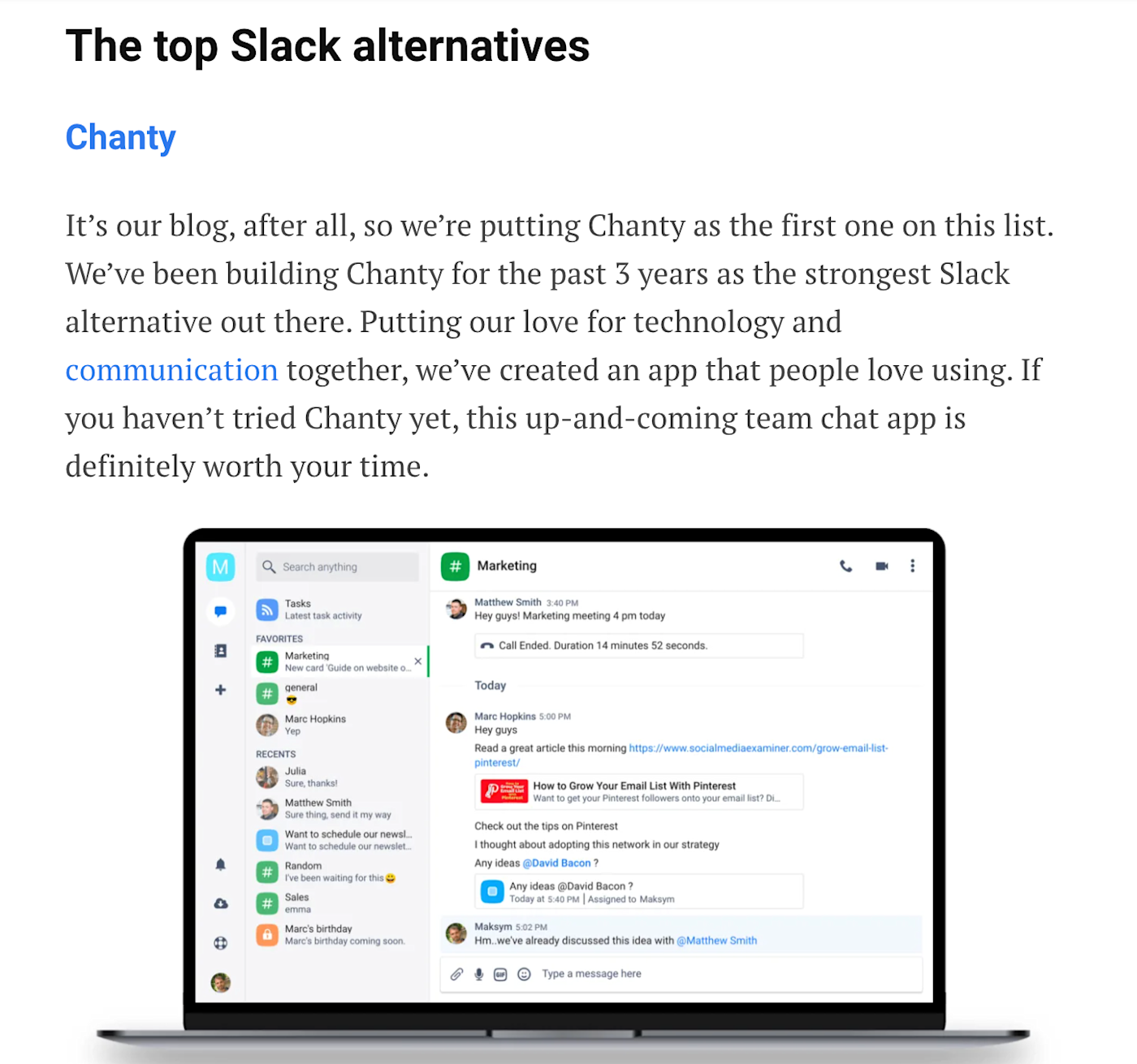 Notice how they not only say it's their own tool (and make it a little personal), but they're super explicit in doing so: "It's our blog, after all, so we're putting Chanty as the first one on this list."