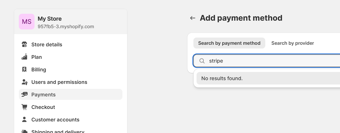 If Stripe gives you a "No results found" notice like the one below, it likely means you either live where Shopify Payments is available or somewhere Stripe is not.