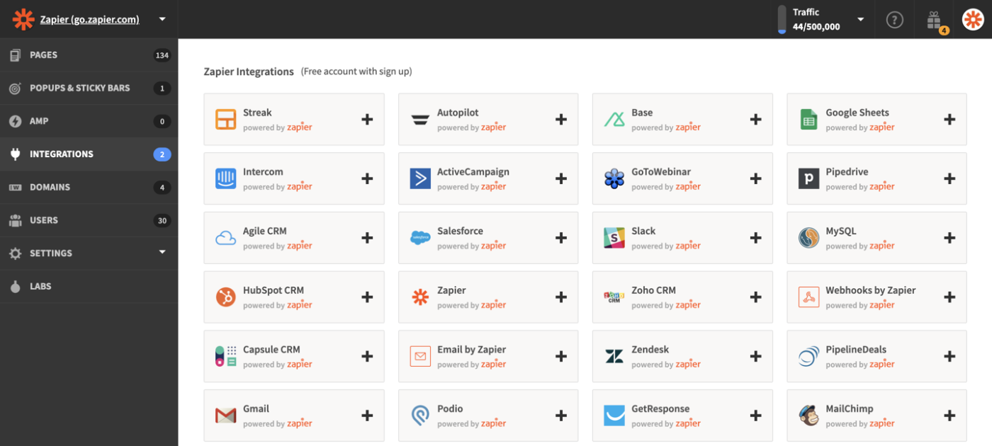 Unbounce has since decided to double down on its partnership and brought Zapier into a more prominent area of their product UI.