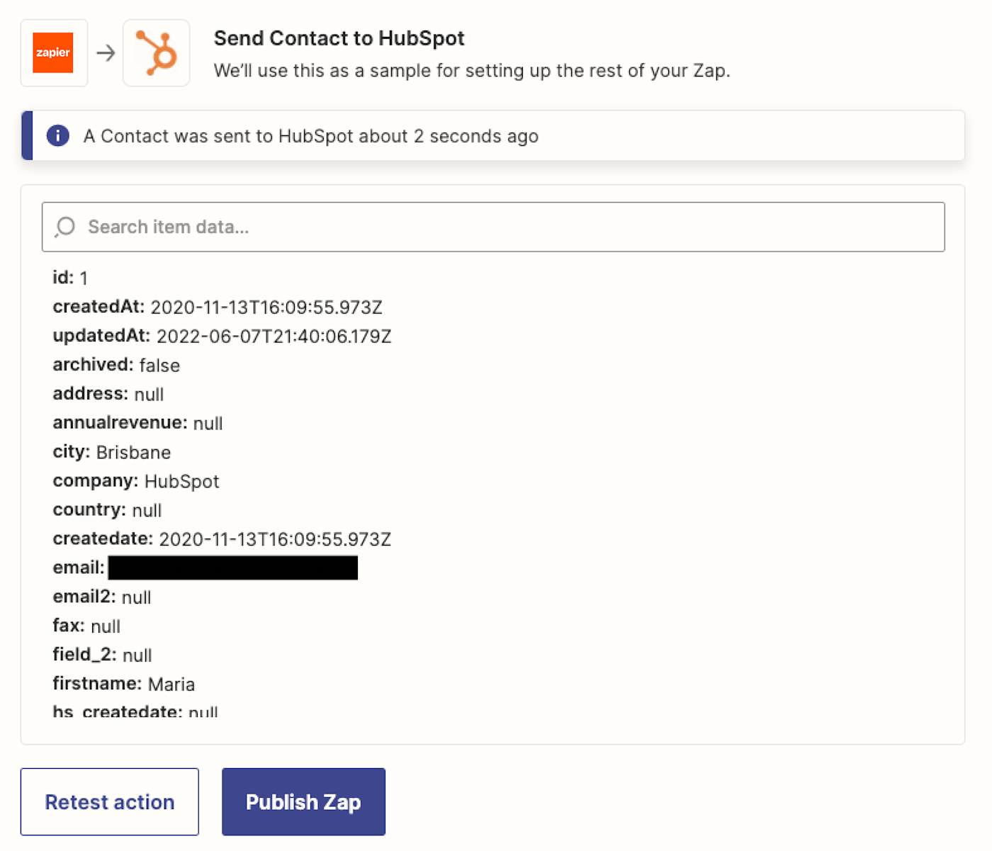 Now test your search action. Zapier will search for an existing HubSpot contact. When you see a success message, check your test data carefully. If Zapier found a HubSpot contact that matches the test data in Google Contacts, _zap_data_was_found will be true, and that contact will be updated. If Zapier finds nothing, this will be false, and a new contact record will be created and then updated.