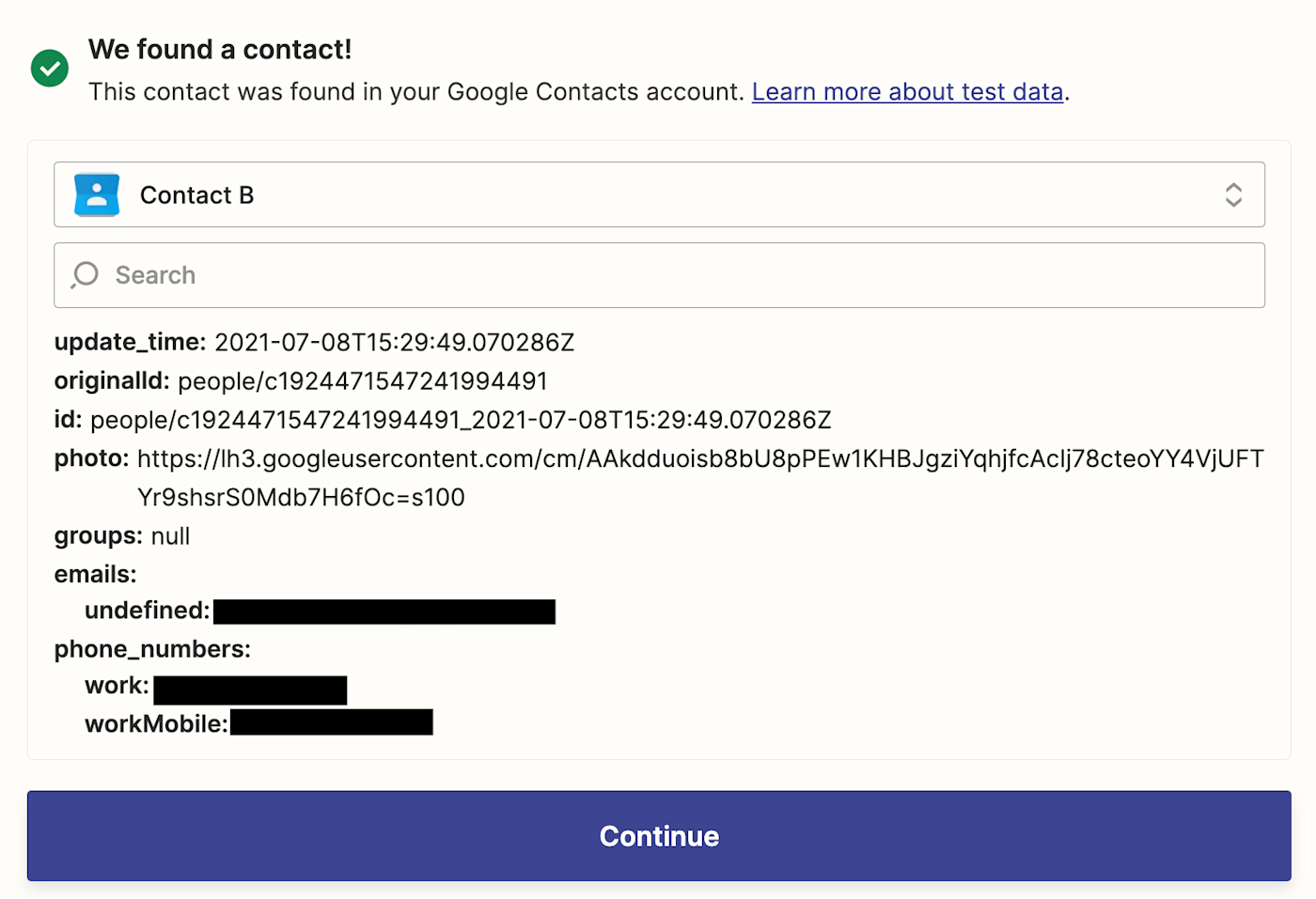 Then, test your trigger. Zapier will look for a recent contact in the Google Contacts account you just connected. You'll use whatever Zapier finds to set up the rest of your Zap.Â